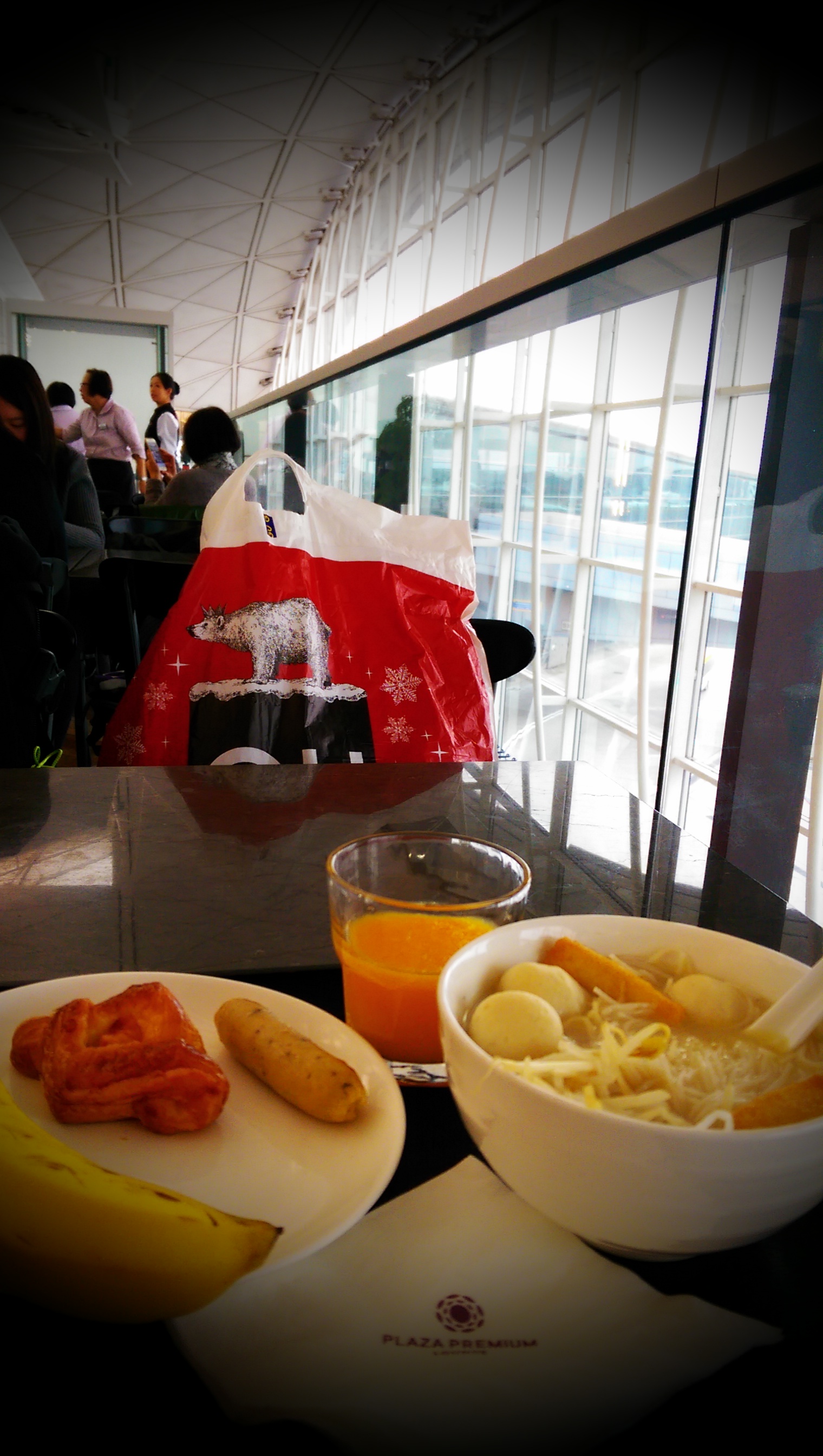 终于到了这场说走就走的旅行了! 一出门就见到机场大巴E22A,顺利!虽然上车了才知道这个比另一部慢,但起码不用在寒风中守候! 到机场,嘿嘿,一个人可以用传说中的贵宾室plaza premium lounge 了。下次宝贝跟我一起出游拿另一张信用卡也可以使用了。只是吃个自助餐而已,没有时间去坐按摩椅。下面是一张充满绿茶婊feel的lomo 照,暗暗地可以看到lounge 的名字哟。