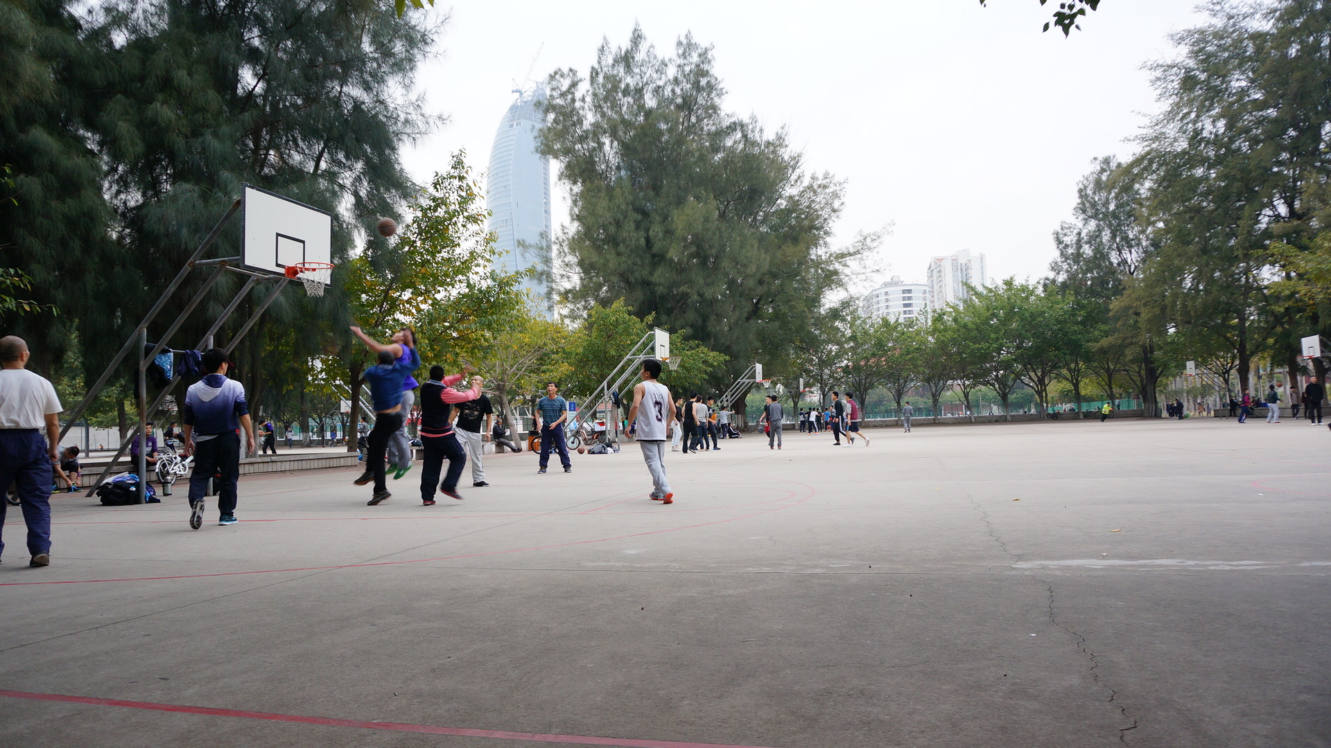 大叔们跟小孩儿打球还是力不从心啊,不时耍耍嘴皮子。