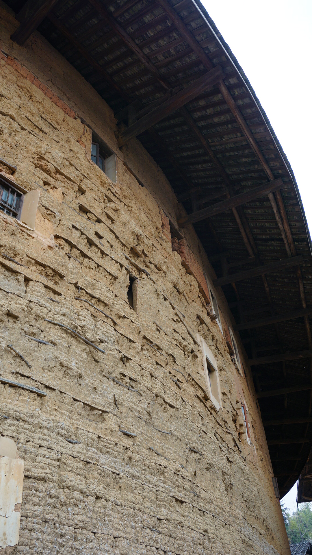 土楼的外墙完全是用天然材料制作的,例如糯米、玉米杆、粘土等等。可以看到一层层的分隔,是因为村民当初在建设土楼的时候,分批煮制原料,待一层成型之后再铺上另一层。所以一个4层楼高的土楼,是需要几代人多达二三十年时间才能完成。