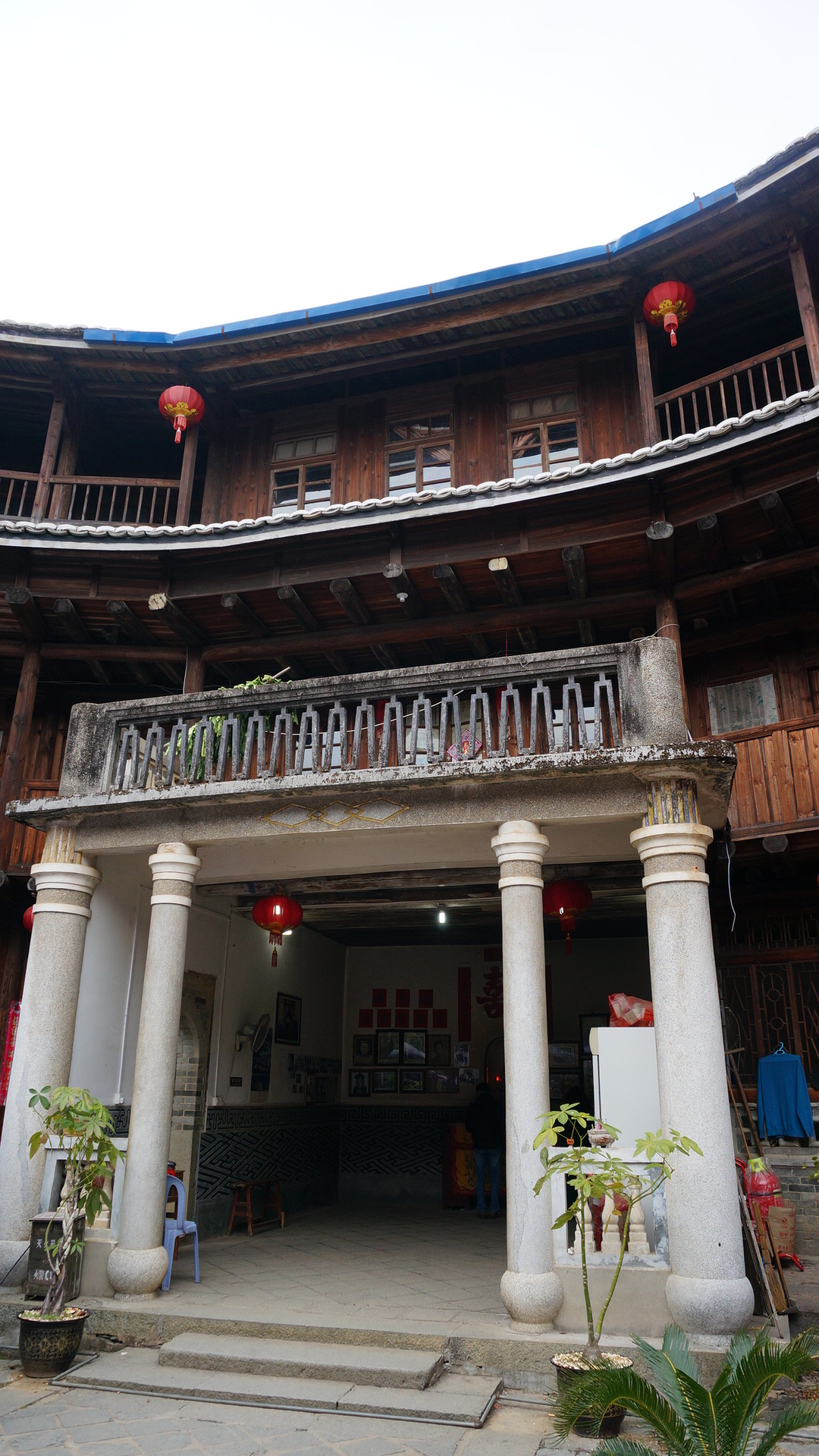 上下4层的土楼,垂直的4间为一房人家拥有。地面的为起居室,2层为粮仓避免潮湿,34层为卧室。内里一圈为各家分别的厕所和厨房。最里一圈为议事厅,由长辈处理家族纠纷和讨论重要事务。
