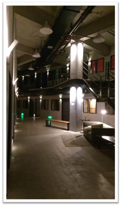 然后就是一路开车去大连。大连的交通很繁忙,也有不同的高速和高架路。幸亏大连的司机开车也比较文明(跟长春的司机比起来)。到达预订的青年旅舍Uniloft 之后,简直是惊艳,完全的工业风,钢筋水泥水管一应俱全,前台还是个美女。3人间我的单人床位分隔在另一边,终于可以稍微隔绝她俩的鼻鼾声了。