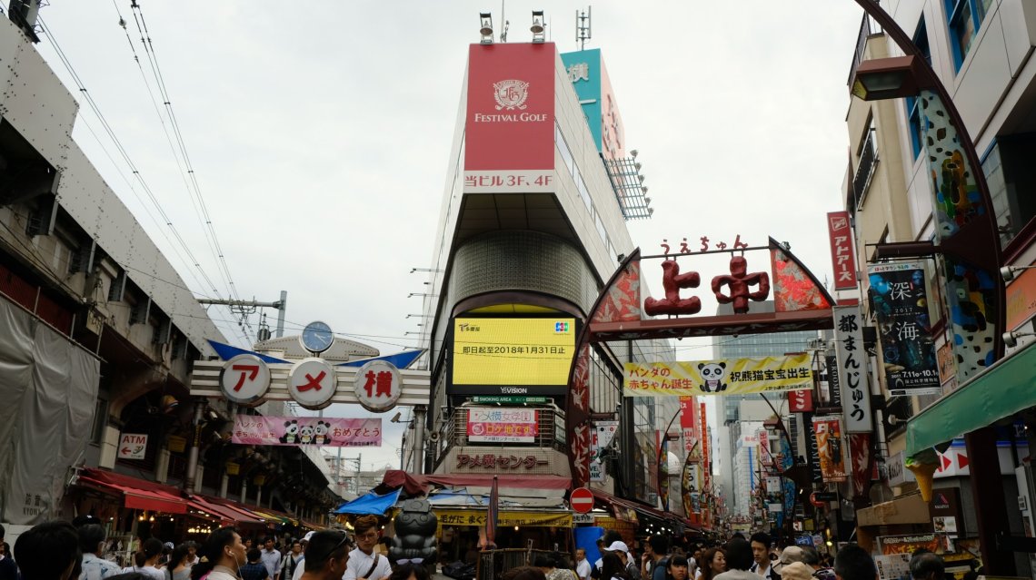 离开浅草寺后,坐地铁来到上野公园(又是东京一个地标, 《標準日本語》里也有介绍(•ω•))旁边的阿美橫町行街先。人超多,有水果、零食,当然重点是买鞋!