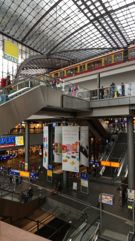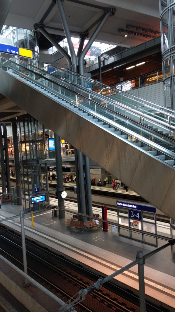 柏林中央火車站外表全部都係玻璃嘅結構,而內裏包含咗南北東西上下幾層嘅火車路軌,同國內、香港火車站最唔同嘅地方係完全冇任何嘅入闸機安檢等等嘅程序,你甚至可以一路杀落去月台先買飛,係我呢個外人看来身在處於嚴重恐襲危機嘅德國嚟講簡直係不可思議。