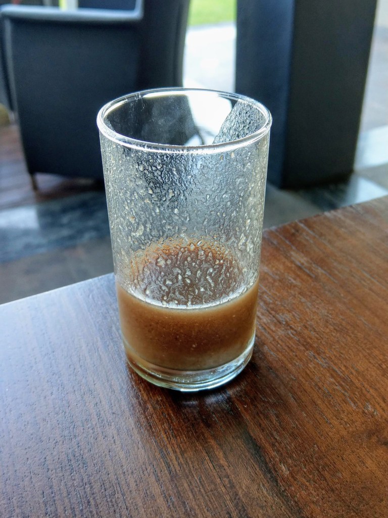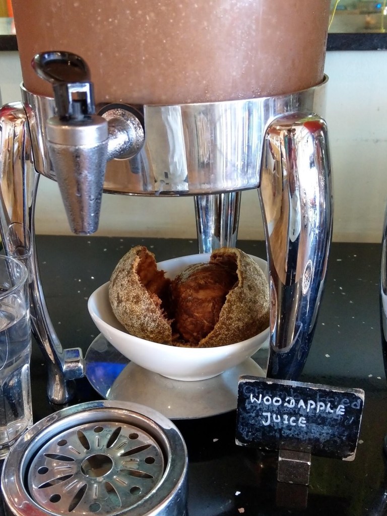 呢杯褐色的黏稠果汁, 就是斯里蘭卡(原來南印度也有)獨有的水果wood apple 象橘(又叫木苹果)榨出嚟的汁液。 气味酸酸叔叔,飲落去酸甜酸甜,好特别的感觉。 要再到后一日,到咗加勒嘅酒店先見到木蘋果嘅真身。