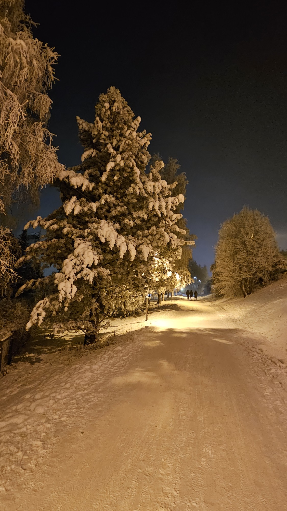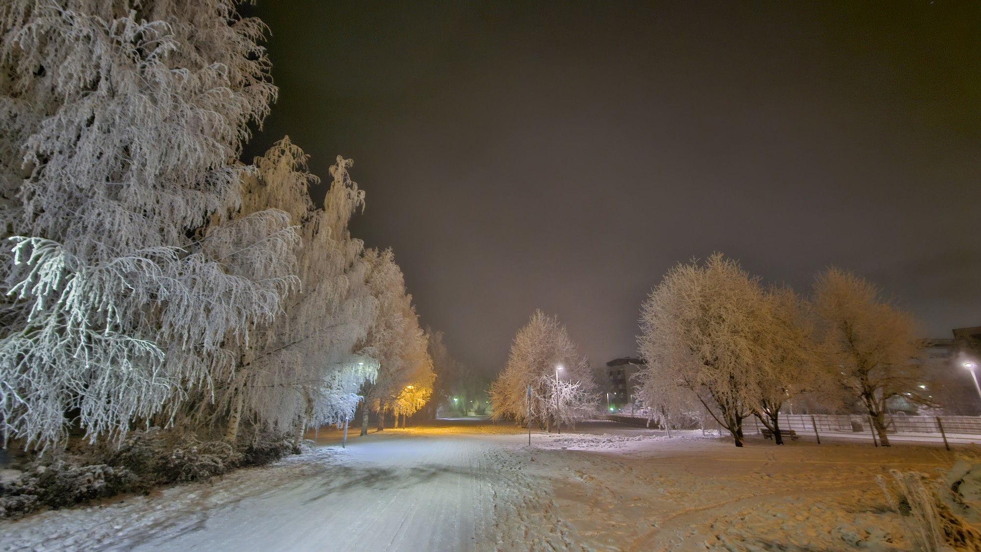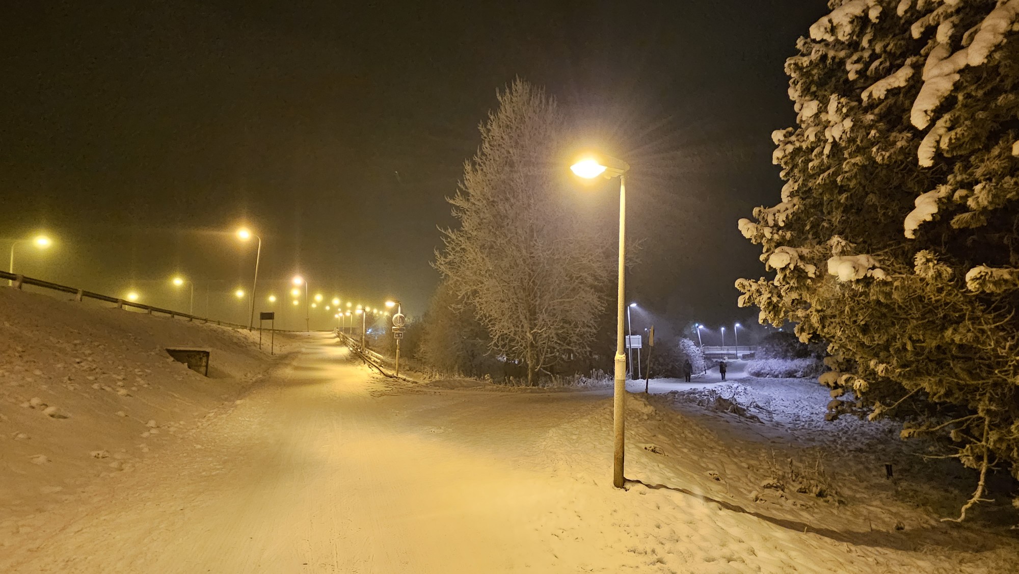 羅瓦涅米市區內最佳觀察極光的點其實是在河邊的極地博物館外面,相對來說周圍燈光較弱,從酒店步行只需十五分鐘左右。10點半出門後,馬路邊的燈光其實非常明亮,加上下小雪,天空還有霧,導致整個天空散射著灰白色的光。